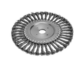 Плоская щетка Сибртех 746387 диаметром 200 мм и посадкой 22,2 мм, с щетиной из крученой проволоки толщиной 0,5 мм, устанавливается на вал УШМ, поддерживающей скорость вращения не более 6000 об/мин. Эффективно удаляет загрязнения, толстый слой ржавчины и лакокрасочных материалов с поверхностей, поэтому используется для проведения грубой (черновой) обработки. Плоской щеткой удобно очищать труднодоступные места, в том числе углы и изгибы.