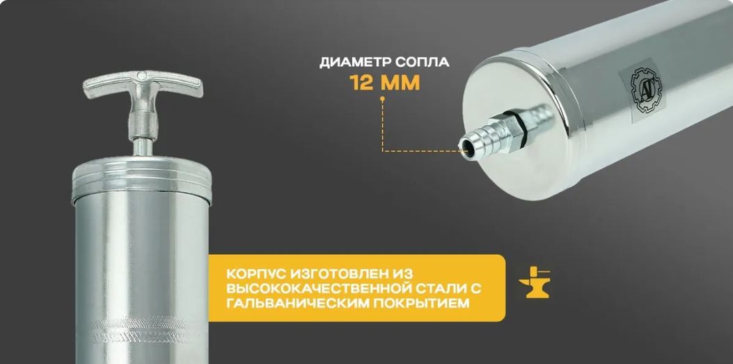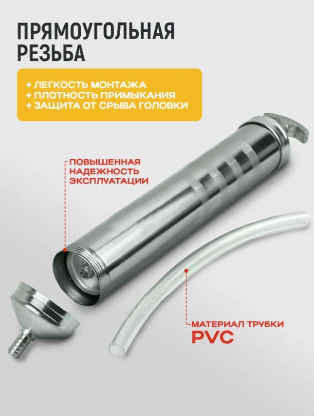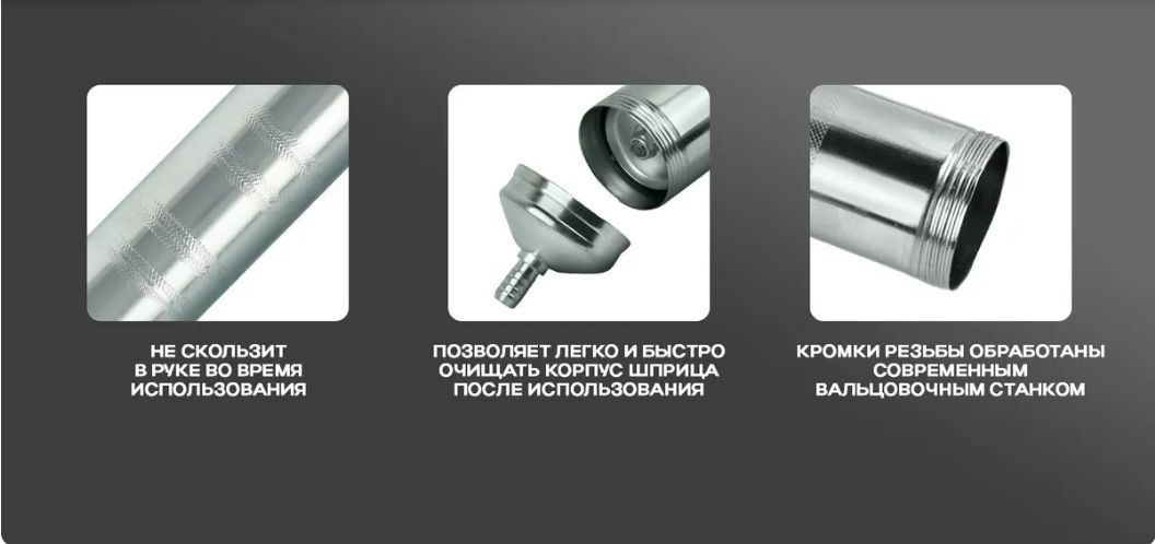 Шприц оснащен крупной резьбой, что обеспечивает надежное соединение с необходимыми деталями и предотвращает утечку смазки. Компактные размеры позволяют использовать шприц даже в ограниченных пространствах.